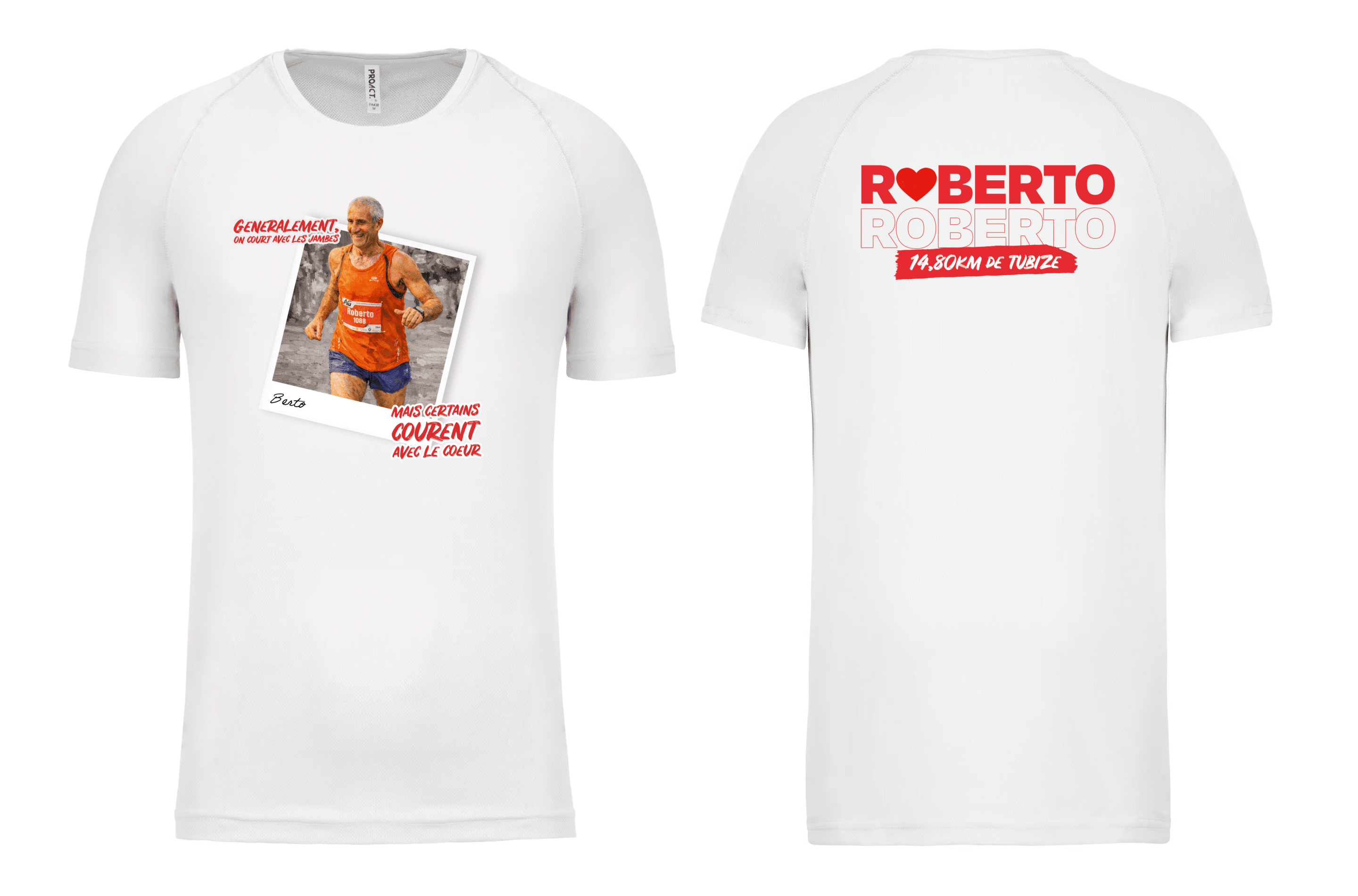 Cette course, c’est aussi le moyen de faire une belle action. En effet, Roberto nous a malheureusement quitté d’un cancer du poumon. C’est pourquoi, l’asbl Roberto Furnari a créé un t-shirt qu’elle met en vente et dont les bénéfices iront directement à la lutte contre le cancer.